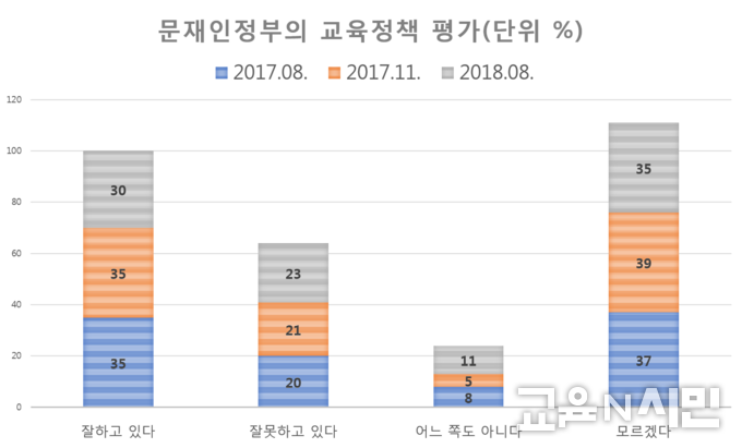 "현정부의 교육정책, 정권초기보다 2018.8. 현재 부정적 평가가 더 늘고 있다."