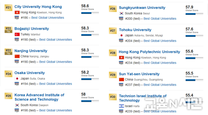 아시아 총 444개 대학중 30위권 대학의 분포를 보면, 중국이 8개로 1위, 일본이 5개로 2위, 홍콩이 5개로 3위, 대한민국과 이스라엘이 각 3개로 4위를 차지 해 부끄러운 성적표를 보이고 있다.