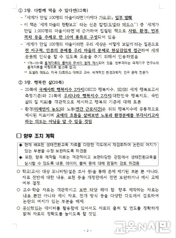 이 답변서에 따르면 '지속가능한 미래를 위한 생태전환교육'에 인용된 '반미감정 부추기기' 자료와 '노동·환경 문제를 과도하게 부각시킨 OECD 국민행복지수 최하위 자료'에 대해서는 "현재 배포된 자료에서 논란의 여지가 있는 부분을 수정·보완하고, 향후 객관적이고 보편타당한 생태전환교육을 실시하도록 자료 전반에 대하여 더욱 엄밀히 인용 자료들을 검토하겠다”고 밝히고 있다.