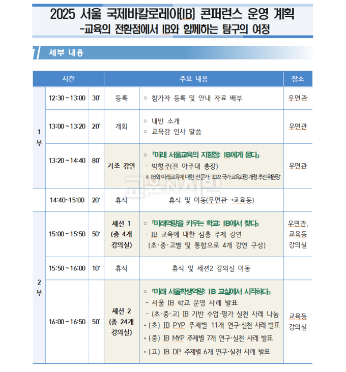 서울특별시교육청(교육감 정근식)은 오는 12월 6일(토) 오후 1시, 서울시교육청교육연수원(서초구 방배3동 소재)에서 「2025 서울 국제바칼로레아(IB) 콘퍼런스」를 개최한다.